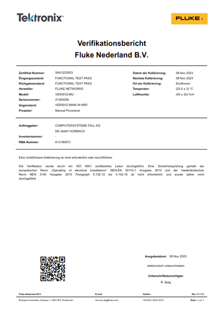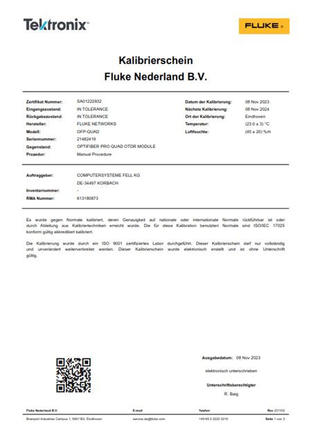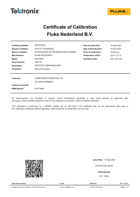 Hier finden Sie die aktuellen Kalibrierungszertifkate für die Komponenten unseres Fluke DSX2-8000 Versiv Messsystems, also die Host- und Remote-Units, sowie die CU, OLTS und OTDR Versiv Module. Bei berechtigtem Interesse senden wir Ihnen die aktuellen Kalibrierzertifikate im PDF Format per Mail zu!